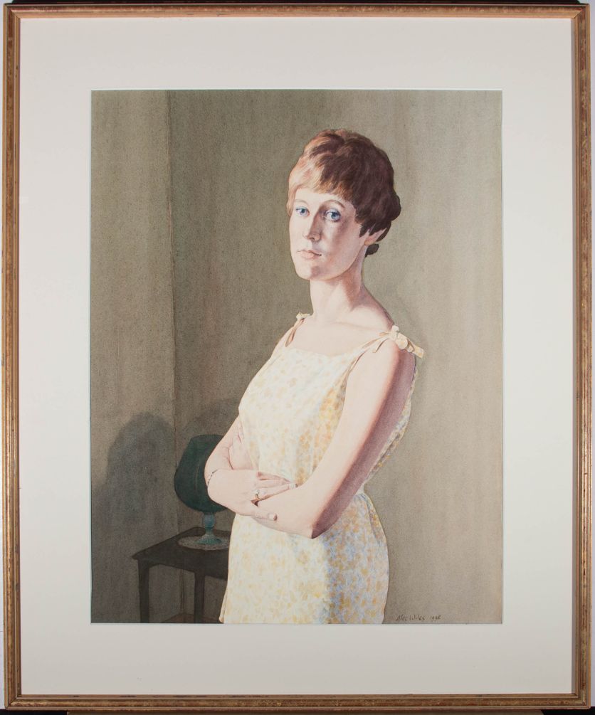 This striking portrait depicts a lady with short cropped hair posing with her arms crossed. Her right hand rests gently on her forearm in a position ideal for showing her sparkling engagement ring. Painted in soft watercolours, Wiles captures the the natural light of the scene which delicately illuminates the woman's profile. Signed and dated to the lower right. Presented in a large, simple wooden frame. On wove.Condition