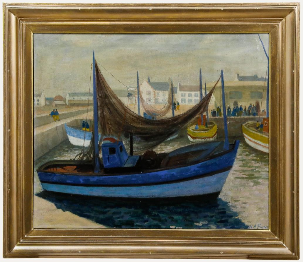 Hubert Arthur Finney (1905-1991) oil on canvas. Brittany fishing boats moored in a harbour, with a prominent blue-hulled vessel in the foreground. The composition captures the quiet atmosphere of a working harbour with figures dotted along the quayside. The painting is well presented in a large gilt effect frame. Signed by the artist to the lower right. (Provenance: The artist's family).Condition