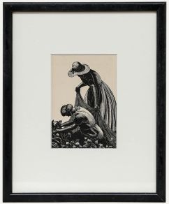 Although known primarily for her work as a printmaker, Clare Leighton (1898-1989) also designed numerous book illustrations, bookplates, engravings, mosaics, and stained glass windows over the course of a long and productive career. She received her early art training at the Brighton College of Art and also attended the Slade School of Fine Art and the Central School of Arts & Crafts, 1920-23 in London. At the latter she worked on engraving under Noel Rooke, making her first woodblocks in 1923. During the 1920s and 1930s she taught, exhibited, and made several lecture tours of the United States. At the outbreak of World War II she moved to America, and in 1945 became an American citizen. Her work is held in the collections of the British Museum, the Victoria and Albert Museum in London, the Metropolitan Museum of Art in New York, and the Art Institute of Chicago.