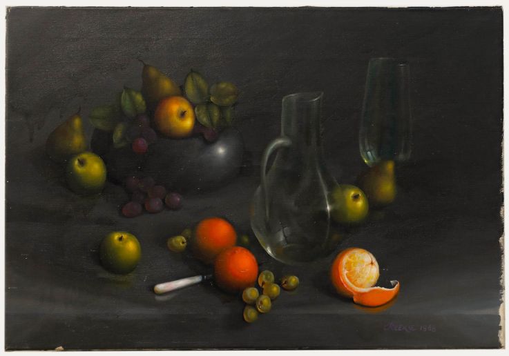 This still life painting masterfully captures the interplay of light and shadow on an array of fruits and glassware. The composition skillfully balances vibrant citrus hues against the muted tones of the glassware and background, creating a striking visual harmony. Signed and dated. On canvas.Condition
