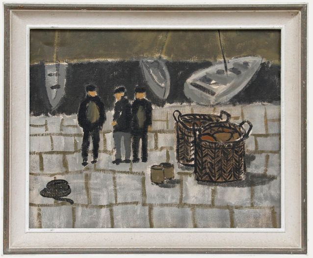 A striking nautical scene depicting three dockworkers standing on a cobbled quayside, catching up before finishing for the day. The figures are anchored by two large woven fishing baskets and a coil of rope, rendered in muted tones of grey, ochre and brown. The work is presented in a contemporary frame that complements the artwork. Unsigned. On canvas.Condition