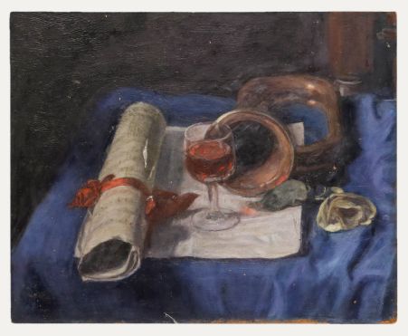 Still life in oil. Unsigned. Inscribed on the reverse with the artist's workings. On board.Condition