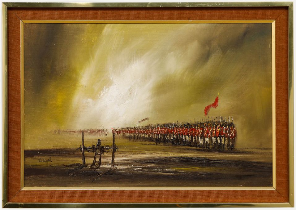 This powerful painting by John Bampfield (b.1947) depicts a dramatic military scene with a long line of soldiers stretching into the distance beneath a turbulent sky. The artist has signed the composition in the lower left, and the painting has been well presented in a gilt-effect frame with a large linen slip. On canvas on stretchers.Condition