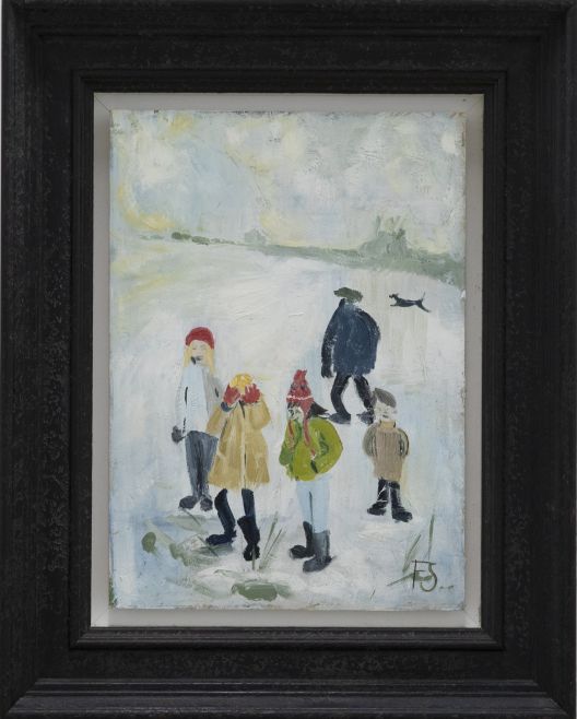 Inspired by the imagery of L.S Lowry's, this naive oil scene depicts the innocent fun of crushing ice puddles as a child. The children's clothes pop against the cold and snowy backdrop, where a father figure stands in a cap and coat walking the family dog. Initialled by the artist to the lower right. The painting has been beautifully float mounted in a texture black frame. On board.Condition