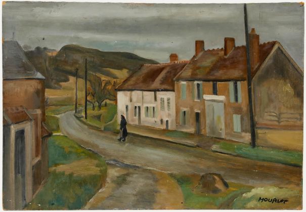 An atmospheric mid 20th century oil by the artist Maurice Mourlot (1906-1983) depicting a lone figure walking through a quaint little village. Signed to the lower right. On board.Condition