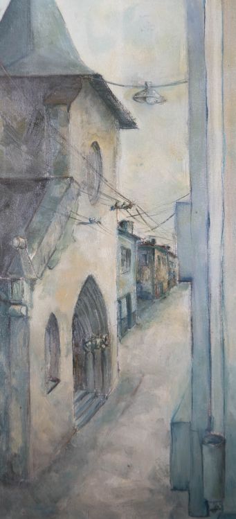 A fine street view in oil, showing a narrow alley running down the side of a rustic church. The artist has used a muted grey palette to achieve this monotone painting. The painting is unsigned. On canvas.Condition