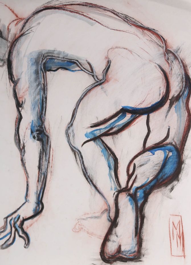 A fine nude study in charcoal, ink and chalk. The artist has initialed to the lower right. On paper.Condition