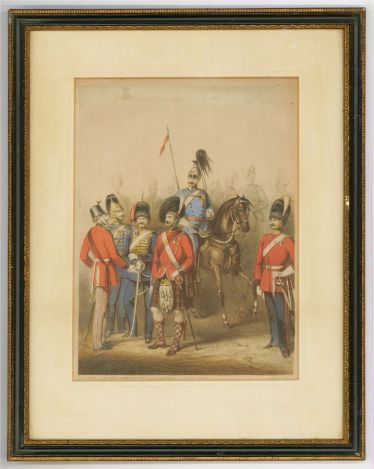 A charming pair of coloured engravings depicting the 1st Royals Horse Artillery and 42nd highlanders, two Scottish regiments in the British Army. Signed illegible. Presented in Hogarth style frames. On wove.Condition