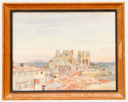 A charming watercolour scene depicting the cathedral of Montpellier in France. Signed to the lower right. Presented in an oak frame with a black slip. On paper.Condition