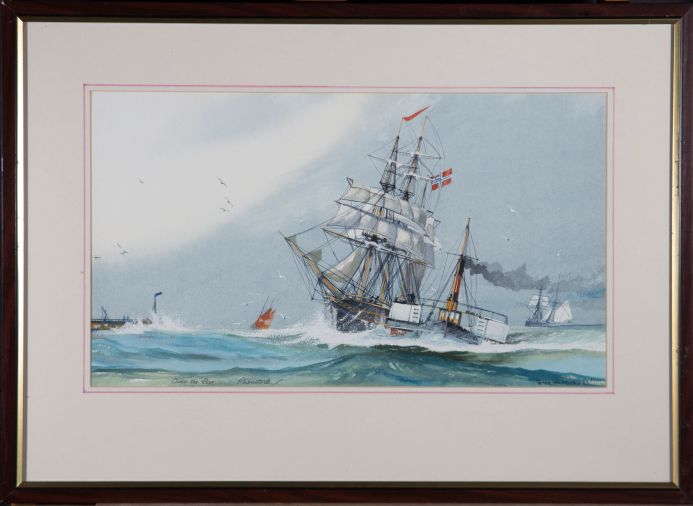 A lovely watercolour showing ships at sea with one flying the Norwegian Flag. Well presented in a lined mount and wooden frame with gilt trim. Inscribed with the title on the lower left and signed and dated to the lower right. On wove.Condition