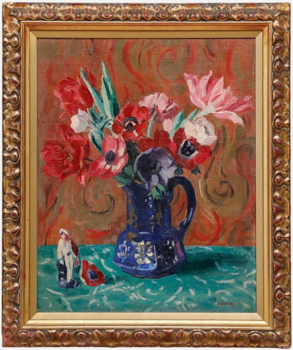 A lively still life by the artist Philip Naviasky (1894-1983), featuring a pink-hued bloom arranged in a glossy cobalt-glazed vase. To the left, a Royal Doulton figurine of a young sailor stands beside a fallen poppy. The composition is set against swirling wallpaper and a richly patterned tablecloth, creating a vibrant and dynamic composition. With areas of light impasto. Signed to the lower right. Handsomely presented in a gilt frame. On board.Condition